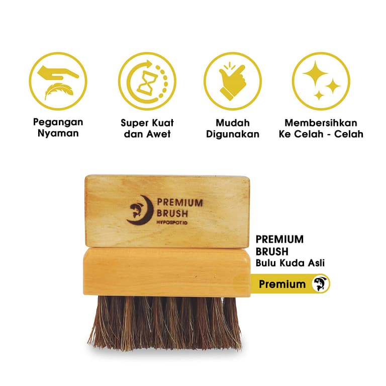 Premium Brush Hypospot terbuat dari bulu kuda asli pilihan yang sudah terjamin lembut, halus, dan juga aman untuk semua bahan sepatu. Kayu pegangan terbuat dari kayu pinus asli yang sudah di finishing halus membuat kalian semakin mudah & nyaman dalam memegang brushnya.